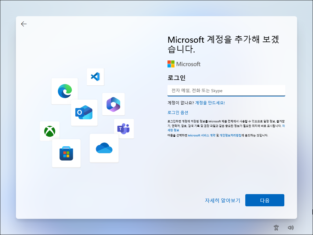 실제로 설치 과정에서 아래와 같이 Microsoft 계정 추가를 위한 로그인 단계에서 "로그인 옵션"을 클릭하여도 로컬 방식으로 설치하는 옵션을 제공하고 있지 않으며, 이 단계에서 어떻게 로컬 계정 방식으로 진행할 수 있는지 VMware 가상 환경 기준으로 설명 드리겠습니다.