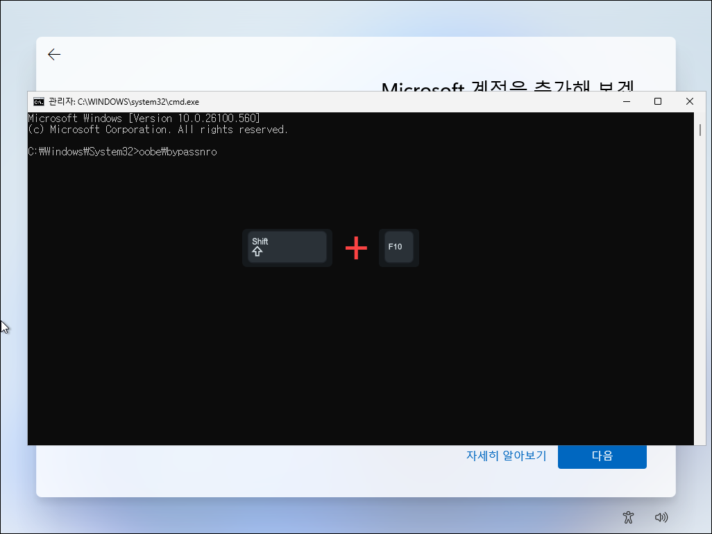 인터넷 연결이 해제된 후 "Shift + F10" 버튼 조합을 이용하여 명령 프롬프트(cmd.exe) 창이 생성되면, "oobe\bypassnro" 명령어를 입력하여 실행합니다.