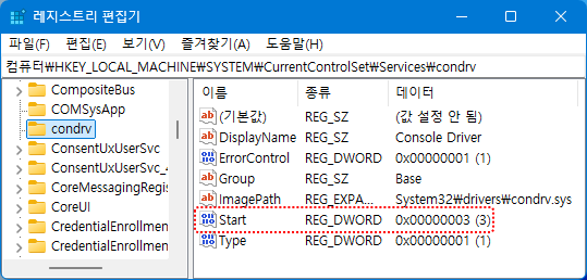 1. 레지스트리 편집기(regedit)를 실행하여 "HKEY_LOCAL_MACHINE\SYSTEM\CurrentControlSet\Services\condrv" 키 값 중 Start 값이 3인지 확인합니다.