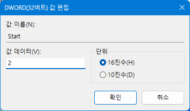 2. Start 이름을 클릭하여 DWORD(32비트) 값을 "3 → 2"로 수정합니다. 참고로 2는 Windows 시스템 시작 시 자동 시작을 의미합니다.