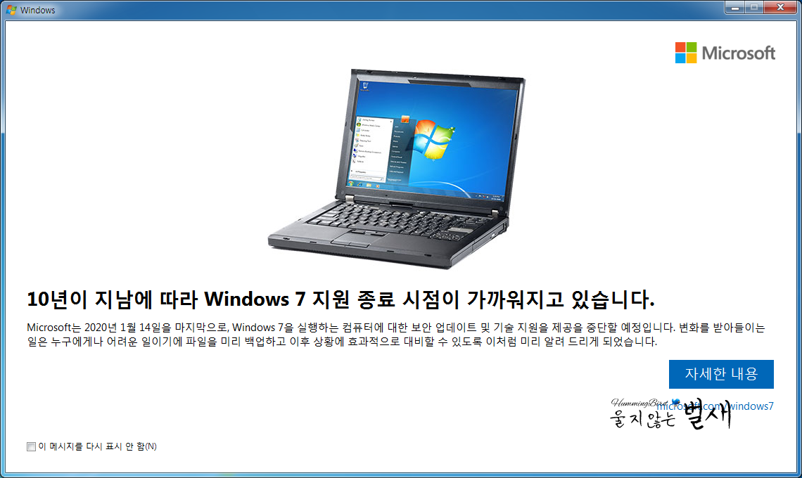 만약 정상적으로 동작할 경우 "10년이 지남에 따라 Windows 7 지원 종료 시점이 가까워지고 있습니다." 메시지 창을 생성하여 2020년 1월 14일을 마지막으로 Windows 7 운영 체제에 대한 보안 업데이트 및 기술 지원 제공을 중단할 예정임을 안내하면서, 자세한 내용은 제공되는 웹 페이지로 연결하고 있습니다.