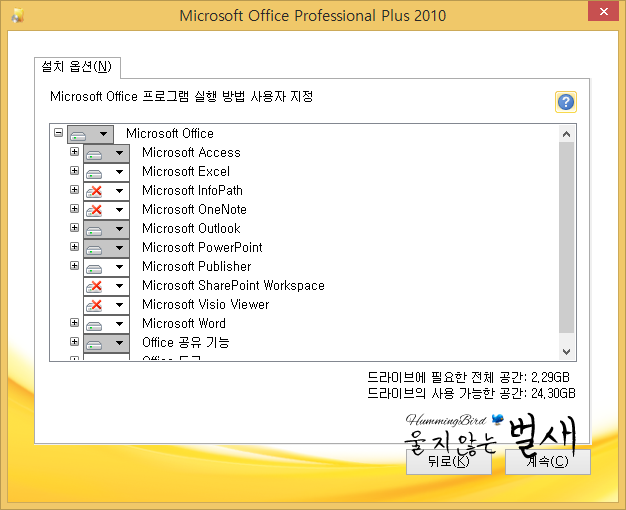 다음 단계에서 현재 설치되어 있는 MS Office 구성 요소가 표시되므로 추가로 설치할 Office 프로그램이 있을 경우 선택하시기 바라며, 변경할 부분이 없는 경우 그대로 계속 진행하시면 됩니다.