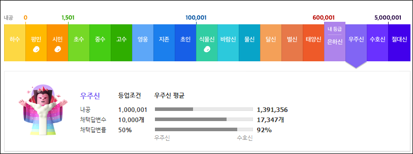은하신 다음으로 우주신이 되기 위해서는 내공은 400,000과 채택 답변수는 3,304개가 필요하며 채택 답변률은 현재 수준으로 충분히 등업 조건을 만족하고 있습니다.