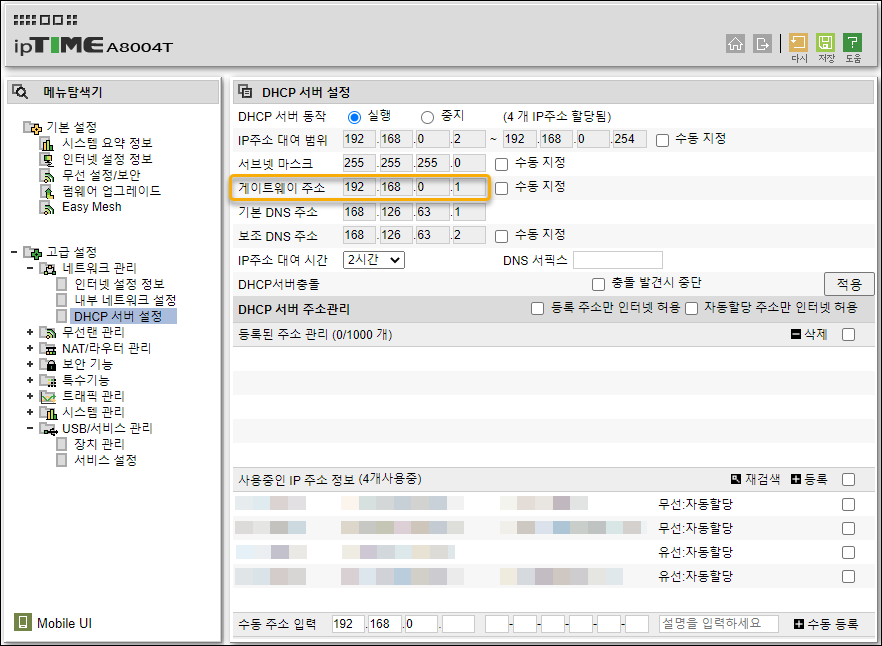 ipTIME NAS 저장 장치가 위치한 공유기(라우터)의 IP 주소를 확인하기 위해서는 다양한 방법이 있지만 기본적으로 공유기 관리 페이지에서 제공하는 게이트웨이(Gateway) 주소 정보를 확인하는 방법으로 공유기 IP 주소를 확인할 수 있습니다.