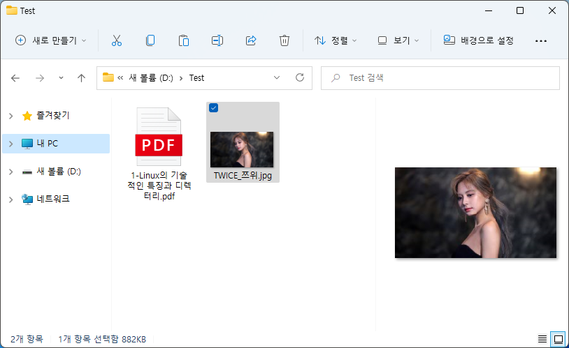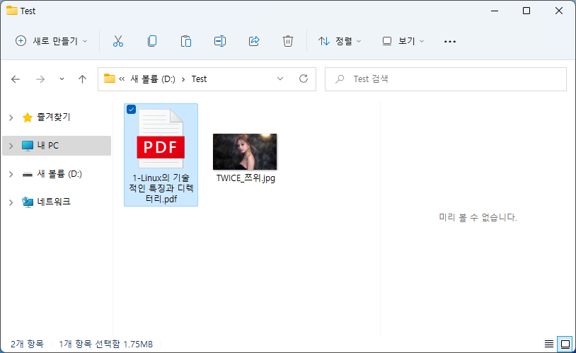 Windows 11 운영 체제 기준으로 Windows 탐색기의 우측 영역에 "미리 보기 창"을 통해 사진, 문서 파일을 미리 보기할 수 있습니다.