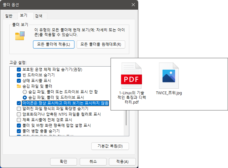 기본적으로 Windows 탐색기에 표시된 사진 파일은 폴더 옵션의 보기탭에서 "아이콘은 항상 표시하고 미리 보기는 표시하지 않음" 항목의 체크 여부에 따라 사진 파일의 아이콘에 이미지를 미리 표시할지 여부를 결정할 수 있습니다.