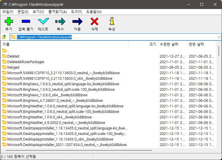 7-Zip 압축 프로그램의 탐색기를 이용하여 "C:\Program Files\WindowsApps" 폴더를 찾아 클릭할 경우 "현재 이 폴더에 액세스할 수 있는 권한이 없습니다." 메시지 출력없이 바로 내부에 접근할 수 있습니다.