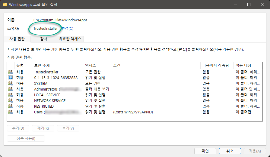 "C:\Program Files\WindowsApps" 폴더에 접근할 수 없는 근본적인 문제는 폴더 소유자가 TrustedInstaller 권한으로 인한 문제로 인터넷 상에서는 대부분이 폴더 권한 자체를 변경하여 접근하는 방법을 소개하고 있습니다.