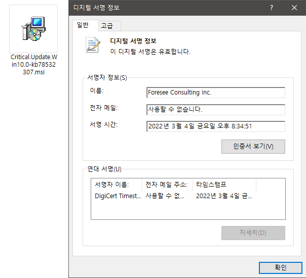 사용자는 다운로드 순간에는 제대로 인지하지 못할 수 있으며, 나중에 다운로드 폴더에 존재하는 Critical.Update.Win10.0-kb78532307.msi 파일을 확인하고 호기심에 실행할 수 있습니다.