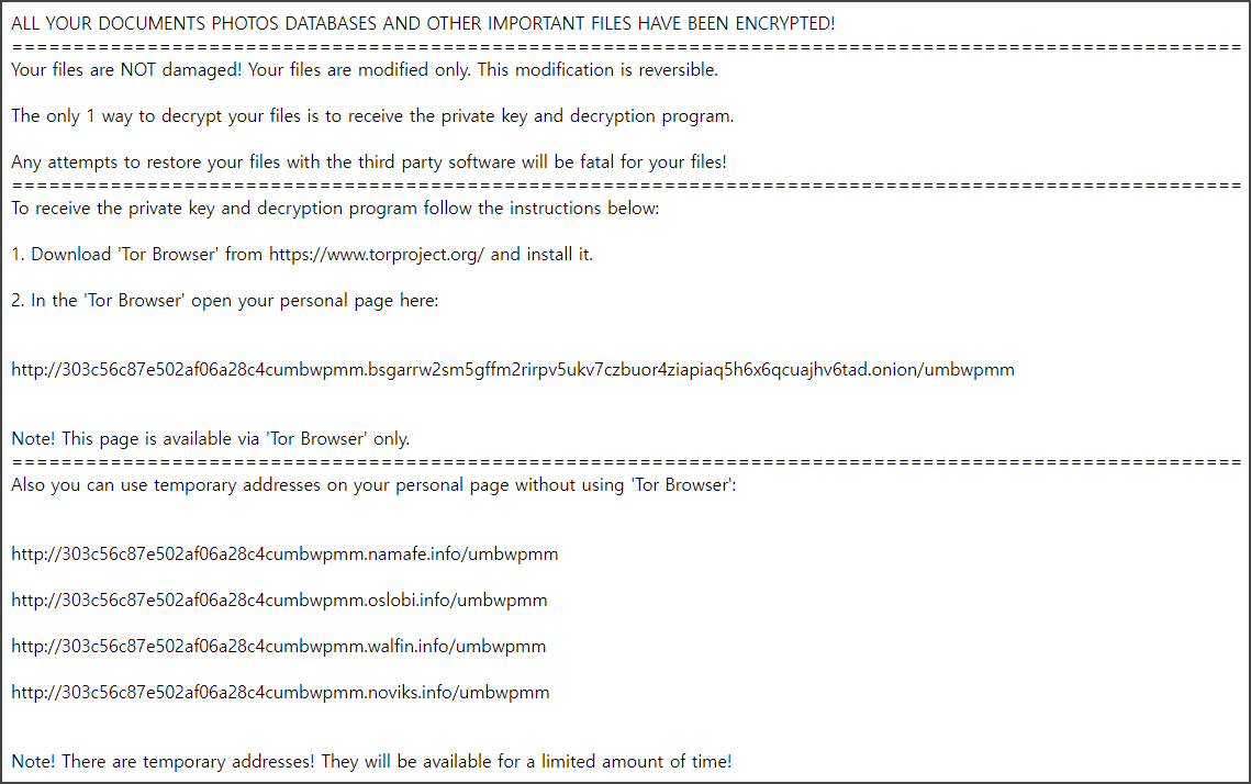 README.html 메시지 파일에서는 Tor 웹 브라우저를 이용하여 특정 사이트로 접속하도록 안내하고 있습니다.