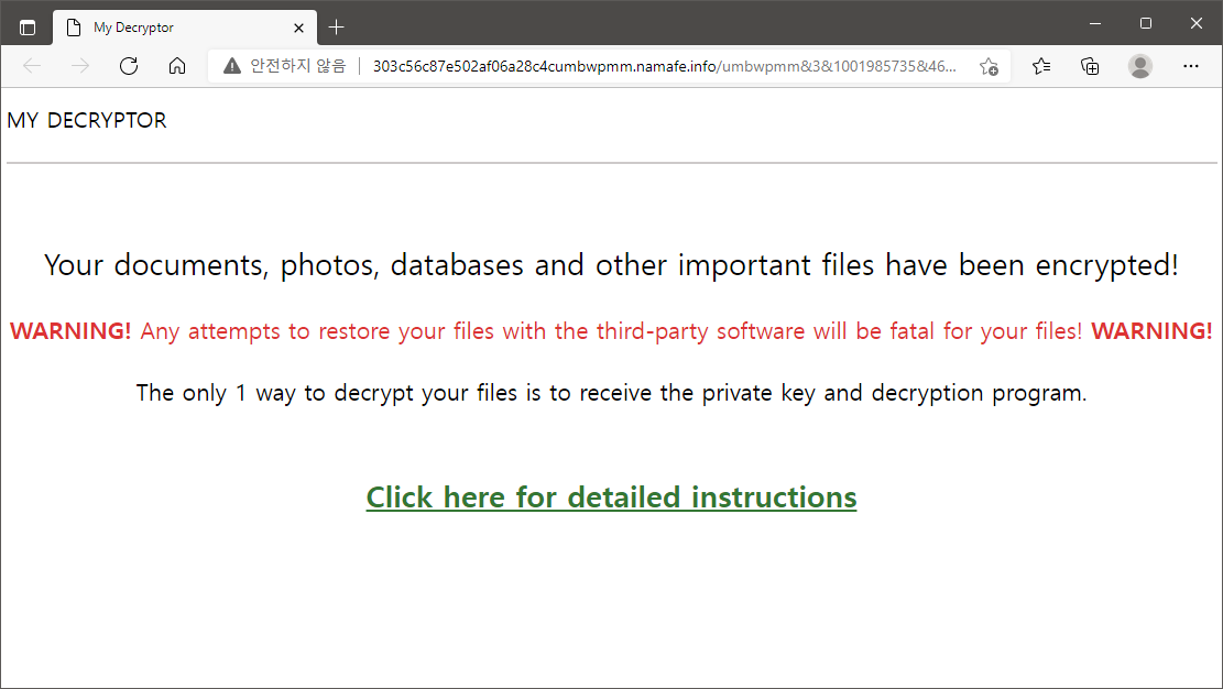 접속된 "MY DECRYPTOR" 사이트에서는 1개의 파일에 대해서 무료 복구를 지원하고 있으며, 주의할 점은 "Click here for detailed instructions" 버튼을 클릭하여 접속하는 순간부터 정해진 기간이 카운터되기 시작합니다.