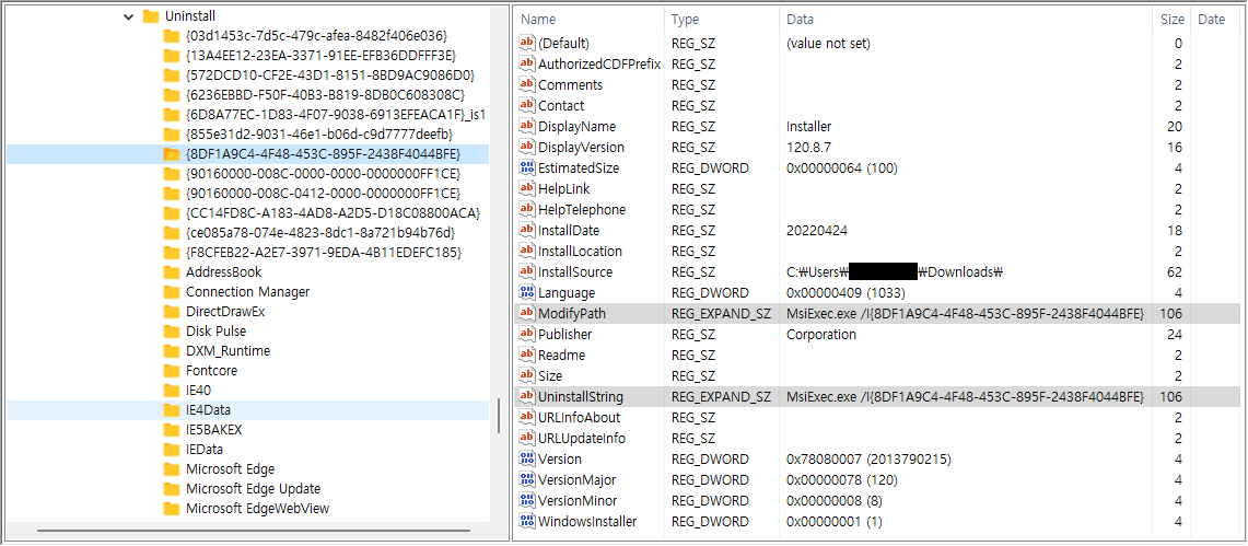 "Microsoft Installer" 앱 삭제 정보를 확인해보면 "HKEY_LOCAL_MACHINE\SOFTWARE\WOW6432Node\Microsoft\Windows\CurrentVersion\Uninstall\{C25ACDCB-DEB1-4E03-B1AF-737874630FEE}" 레지스트리 값으로 표시하고 있으며, 수정 및 제거 시 "MsiExec.exe /I{C25ACDCB-DEB1-4E03-B1AF-737874630FEE}" 실행 코드값을 가지고 있습니다.