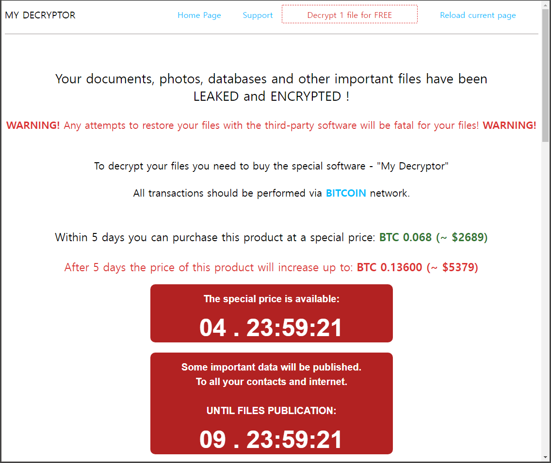 또 하나의 흥미로운 점은 Magniber 랜섬웨어 감염 시 연결되는 결제 안내 페이지에서 제시하는 가격 외에 감염자 PC로부터 수집된 일부 중요 데이터를 정해진 기간 안네 돈을 지불하지 않을 경우 인터넷에 공개한다는 협박 정보가 포함되어 있다는 점입니다.