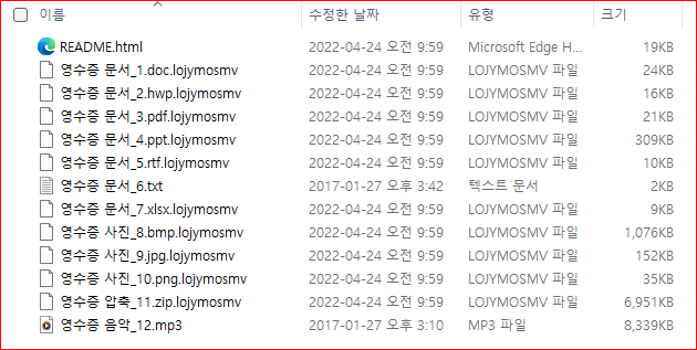 Magniber 랜섬웨어는 감염 시간대에 따라 .<7~9자리 영문 소문자 Random 확장명>을 사용하고 있으며, 각 폴더마다 README.html 금전 요구 메시지 파일을 생성합니다.