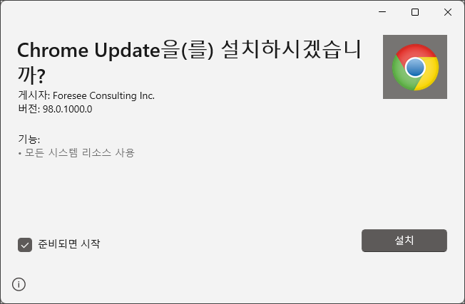 웹 사이트 접속 과정에서 최신 웹 브라우저 업데이트 안내를 통해 다운로드된 Upgrade_Chrome_98.0.1000.0.appx 설치 파일을 사용자가 실행할 경우 "Chrome Update을(를) 설치하시겠습니까?" 설치창을 통해 설치를 진행할 경우 Magniber 랜섬웨어가 동작하게 됩니다.