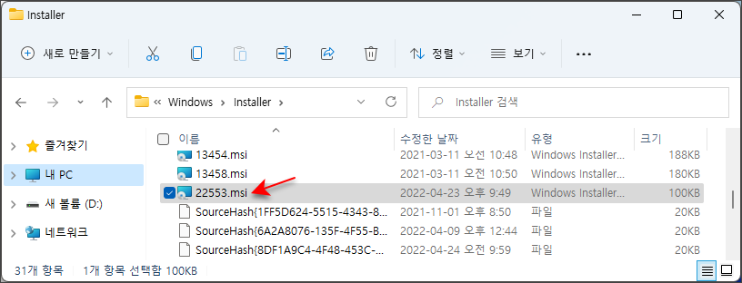 Installer 앱은 최종적으로 "C:\Windows\Installer\22553.msi" 파일을 실행하도록 구성되어 있는 것을 확인할 수 있습니다.