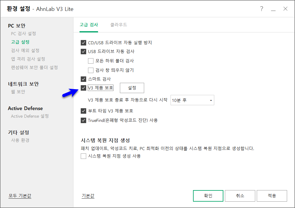 폴더 삭제 후에는 반드시 "V3 제품 보호" 옵션을 활성화(ON)하여 이전 상태로 설정하시기 바랍니다.
