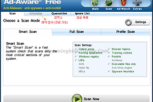 해외 Lavasoft사에서 서비스하는 무료 보안제품 Ad-Aware Free Anti-Malware 8.1.0 프로그램의 악성코드 검사(Scan), 실시간 검사(Ad-Watch) 그리고 추가 기능에 대해 살펴보도록 하겠습니다. 1. Scan(악성코드 검사) 악성코드 검사는 Smart Scan(빠른 검사), Full Scan(전체 검사), Profile Scan(사용자 지정 검사) 방식으로 구분되어 있습니다. 참고로 Scheduler(예약 검사) 방식은 무료 버전에서는 비활성화 되어 있으며, 유료 버전에서 제공하는 기능입니다. 그림에서와 같이 각 검사에 따른 검사 항목 설정 내역을 상세하게 확인할 수 있으며, 환경 설정(Settings) 항목에서 변경하실 수 있습니다. 테스트에서는 마우스 우클릭 방식의 특..