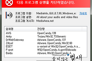 특정 백신 프로그램을 이용할 때는 몰랐지만 앱체크(AppCheck) 보조 백신과 같은 다중 백신을 통한 파일 감시가 가능해지면서 평소 문제없이 사용하던 프로그램 설치시 다수의 백신 프로그램이 차단을 하는 경우를 경험할 수 있습니다. 예를 들어 동영상, 음악 파일 정보를 확인할 수 있는 MediaInfo 설치 파일(SHA-1 : 26a0144877429c93b19cb4d6ed95343fe813fa3c)을 실행할 경우 OpenCandy 진단명으로 진단되고 있습니다. OpenCandy 광고 솔루션은 해외에서 제작된 프로그램 설치 과정에서 추가될 수 있는 제휴 프로그램을 통해 쉽게 볼 수 있으며, 대표적으로 μTorrent 파일 공유 프로그램 설치시 추가되는 제휴 프로그램이 이에 속합니다. 프로그램 설치시 화면..