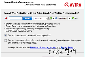해외 무료 백신으로 유명한 Avira Free Antivirus 제품에서는 인터넷 보호(Internet Protection)를 위해 Web Protection 기능을 사용자의 선택 사항으로 제공하고 있습니다. Web Protection 기능은 Avira Free Antivirus 제품을 설치하는 과정에서 사용자가 "Avira SearchFree Toolbar" 설치 단계에서 "Accept" 버튼을 클릭하시면 사용할 수 있는 기능입니다. 그러므로 반드시 Avira SearchFree Toolbar 프로그램을 설치하시기 바라며, 단지 설치시 "Set and keep Ask as my default search provider", "Set and keep Avira SearchFree (avira.search..