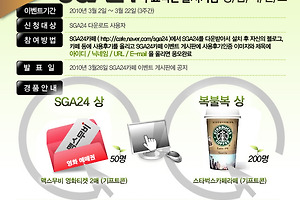 국내 보안 제품 바이러스 체이서(Virus Chaser)에서 제공하는 무료 백신 SGA24 출시 기념 경품 이벤트를 소개해 드리겠습니다. 해당 무료 백신 SGA24 제품은 바이러스 체이서에서 그 동안 사용하던 러시아 보안 제품 Dr.Web 엔진이 아닌 알약(AlYac), nProtect, 하우리(Hauri), 에브리존(EveryZone) 업체에서 사용하는 BitDefender 엔진으로 교체된 것으로 알려져 있으므로 참고하시기 바랍니다. 1. 이벤트 기간 : 2010년 3월 2일 ~ 2010년 3월 22일 2. 참여 대상자 : SGA24 다운로드 사용자 3. 참여 방법 : SGA24 카페에서 제공하는 SGA24 다운로드 및 설치 후, 본인이 운영하는 블로그(Blog), 카페(Cafe) 등에 사용 후기(리뷰..